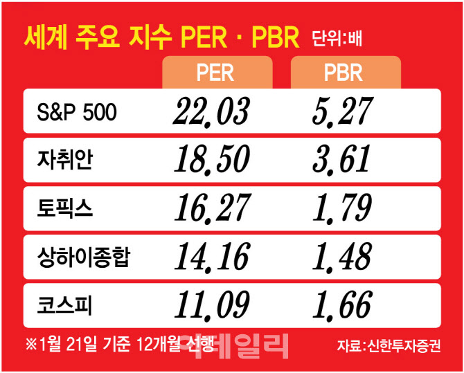 12개월 선행 주가수익비율(PER)을 기준으로는 여전히 하위다. 코스피 PER은 11.09배로 S&P500 22.03배, 가권 18.50배, 토픽스 16.27배, 상해종합 14.16배와 격차가 있다.