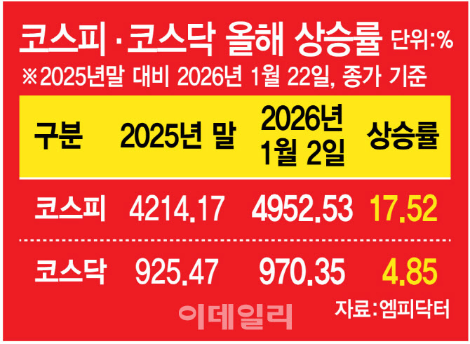 양지환 대신증권 리서치센터장은 “투자자들은 코스피에서 정책 모멘텀을 이미 확인했다”며 “연초 중소형 성장주와 코스닥 강세 패턴이 더해지며 정책 기대감이 유효한 코스닥의 상대적 강세가 예상된다”고 짚었다.
