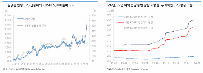 단기 조정 가능성도 제기했다. 이 연구원은 “최근 선행EPS 급등세가 진정되며 지난해 12월16일 이후 코스피 상승률 24.8%가 EPS 상승률을 앞서감에 따라 단기 과열 해소와 매물 소화 국면을 감안해야 할 시점”이라고 지적했다.