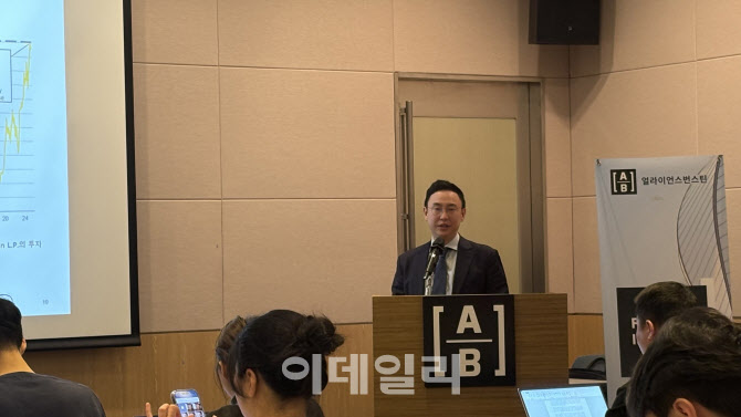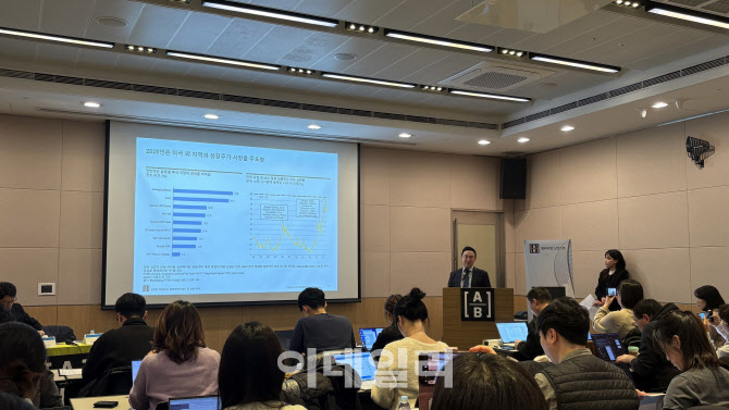 이재욱 AB자산운용 파트장이 28일 서울 여의도 FKI빌딩에서 열린 ‘2026년 상반기 글로벌 주식시장 전망’ 간담회에서 발표하고 있다.