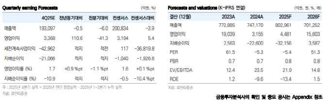 황규원 유안타증권 연구원은 29일 보고서에서 “빅배스 이후 2026년 흑자 전환을 기대할 수 있다”며 “2026년 예상 실적은 매출액 70조 1000억원, 영업이익 1조 6000억원(영업이익률 2.2%), 지배주주 순이익 3587억원”이라고 밝혔다.