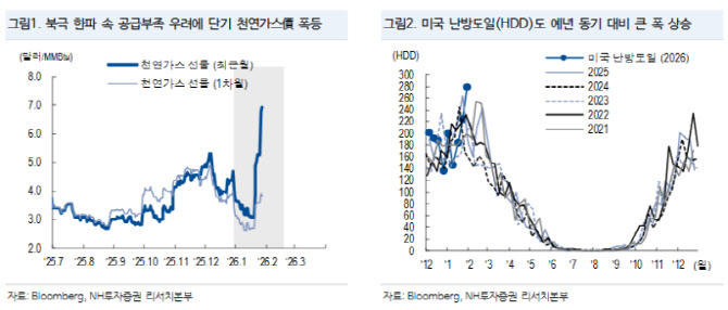 유럽 가스(TTF) 가격도 동반 급등했다. 난방 시즌(11~3월) 재고가 타이트한 상황에서 미국산 LNG 수출 모멘텀이 부각됐기 때문이다. 다만 한파가 미국 내 LNG 수출(처리) 시설까지 타격을 주면서 단기 시장은 LNG 수출 감소보다 난방 수요 급증에 과도하게 반응했을 가능성이 크다고 황 연구원은 판단했다.