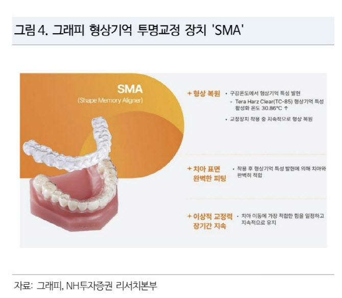 심의섭 연구원은 “그래피는 형상기억 3D 프린팅 투명 교정장치 ‘SMA(Shape Memory Aligner)’를 세계 최초로 개발·상용화한 기업으로, 기존 투명교정장치와 브라켓·와이어 교정 방식의 한계와 약점을 극복한 차세대 혁신 제품을 보유하고 있다”며 “교정장치 제작에 필요한 전 공정 통합 솔루션을 제공하며, 주문생산·원내생산 등 맞춤형 사업모델을 기반으로 글로벌 시장 공략을 지속하고 있다”며 이같이 말했다.