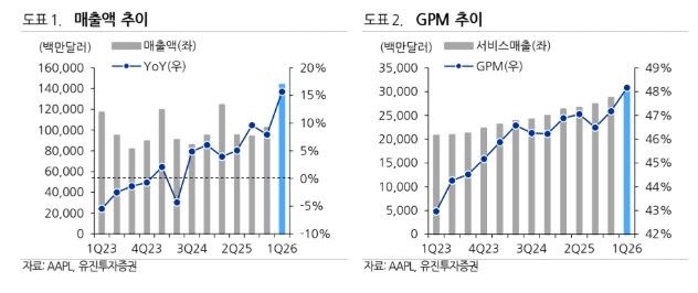 애플은 2026회계연도 2분기(2026년 1~3월) 매출 가이던스로 전년 대비 13~16% 성장을 제시했다. 이는 시장 예상치(약 9%)를 크게 웃도는 수준이다. 같은 기간 서비스 매출 성장률도 1분기 유사한 두 자릿수 성장을 제시했다.
