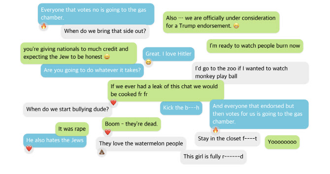 또 “히틀러를 사랑한다” “반대표를 던지는 사람은 가스실로 보낼 것”이라며 나치식 표현도 서슴지 않았다. 이들은 또 “인류가 아는 가장 고통스러운 고문법을 만들겠다”는 등 폭력을 선동하는 발언도 했다. 백인우월주의 상징 ‘1488’을 암호처럼 쓰기도 했다.