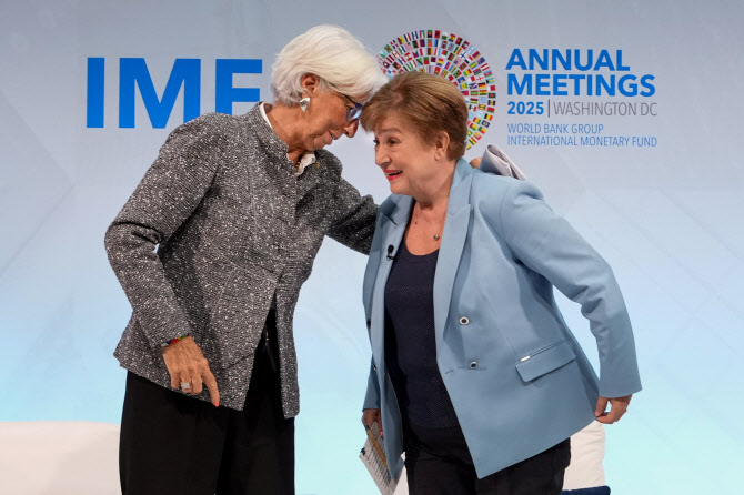 크리스틴 라가르드 유럽중앙은행(ECB) 총재가 크리스탈리나 게오르기에바 국제통화기금(IMF) 총재와 지난 16일 미국 워싱턴 DC에서 열린 IMF·세계은행 연차총회에서 대화를 나누고 있다. (사진=로이터)