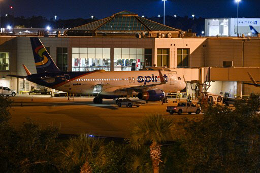 10월 31일(현지시간) 플로리다주 올랜도의 올랜도국제공항 활주로에 스피릿항공 여객기가 서 있다. 이날 공항에서는 미 연방정부 셧다운 여파로 다수의 항공편이 결항됐다.(사진=AFP)