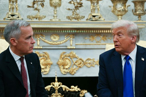 지난 10월7일(현지시간) 워싱턴 D.C. 백악관 오벌오피스에서 도널드 트럼프 미국 대통령(오른쪽)과 마크 카니 캐나다 총리이 회담하고 있다.