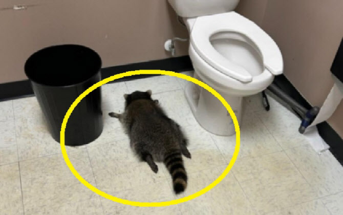 라쿤이 화장실 변기 옆에서 완전히 만취한 채 기절해 대(大)자로 뻗어 있었던 것이다.