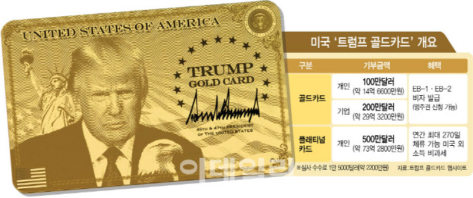 트럼프 대통령이 게재한 웹사이트에 따르면 개인은 100만 달러(약 14억 6600만원), 기업은 200만 달러(약 29억 3200만원)를 각각 미 상무부에 기부하면 골드카드 신청이 가능하다. 다만 미 국토안보부에 심사 수수료 1만 5000달러(약 2200만원)를 내야 한다. 골드카드 신청이 승인되면 영주권 신청이 가능한 EB-1 또는 EB-2 비자를 발급받을 수 있다.