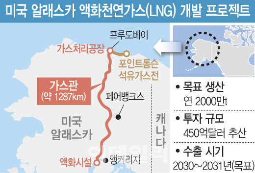 사업비 450억달러(약 66조원)로 추정되는 이 프로젝트의 정식 명칭은 ‘노스슬로프 파이프라인 프로젝트’다. 북극권의 가스전에서 알래스카 남부까지 800마일(약 1287㎞)의 파이프라인을 건설한 후 천연가스를 액화해 연간 2000만t 규모 LNG를 생산하고, 2030~2031년부터 수출하는 것을 목표로 한다.
