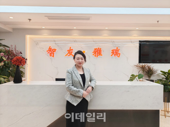 잉위페이 베이징즈유연구원 부원장이 베이징 본사 사무실 앞에서 포즈를 취하고 있다. (사진=이데일리 이명철 특파원)