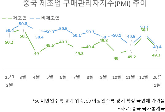 비제조업 PMI도 전월(50.2)보다 하락한 49.4를 기록하며 위축 국면으로 돌아섰다. 비제조업 PMI는 지난해 10월까지 확장 국면을 유지했으나 11월(49.5) 위축, 12월(50.2) 확장 등 들쑥날쑥한 흐름이다.