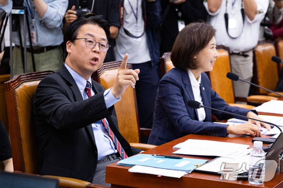 곽규택 국민의힘 의원이 24일 서울 여의도 국회에서 열린 제429회 국회(정기회) 법제사법위원회 제6차 전체회의에서 추미애 법사위원장의 의사진행에 항의하고 있다. 2025.9.24/뉴스1 © News1 유승관 기자