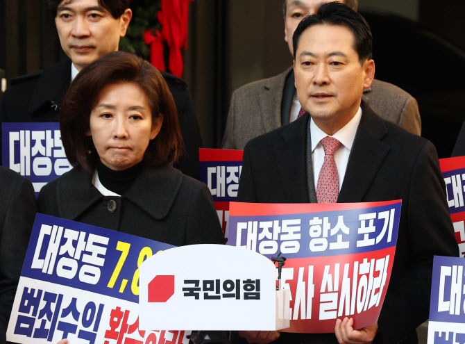 국민의힘 장동혁 대표와 나경원 의원 등이 19일 남욱 변호사가 추징보전 해제를 요구한 서울 강남구‘청담동 건물‘을 찾아 발언하고 있다. (사진=연합뉴스)