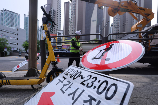 사진은 13일 서울 서초구 반포 학원가에서 관계자들이 ‘킥보드 없는 거리’ 표지를 설치하는 모습.(사진=연합뉴스)
