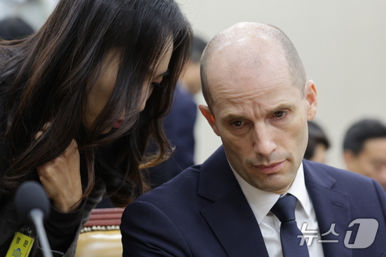 해롤드 로저스 쿠팡 대표이사가 17일 서울 여의도 국회에서 열린 과학기술위원회 쿠팡 침해사고 관련 청문회에 출석해 관계자와 대화를 나누고 있다. 2025.12.17/뉴스1 © News1 신웅수 기자