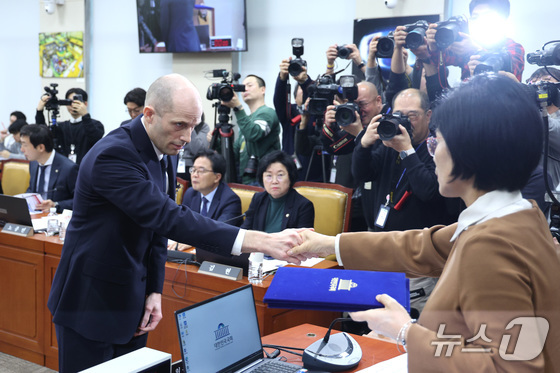 해롤드 로저스 쿠팡 임시 대표가 17일 서울 여의도 국회 과학기술정보방송통신위원회에서 열린 쿠팡 침해사고 관련 청문회에서 증인 선서문을 최민희 위원장에게 전달하고 있다. 2025.12.17/뉴스1 © News1 신웅수 기자