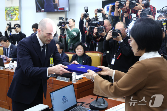 해롤드 로저스 쿠팡 임시 대표가 17일 서울 여의도 국회 과학기술정보방송통신위원회에서 열린 쿠팡 개인정보 유출 사고 관련 청문회에서 증인 선서를 마친 후 최민희 과방위원장에게 선서문을 전달하고 있다. 2025.12.17/뉴스1 © News1 유승관 기자