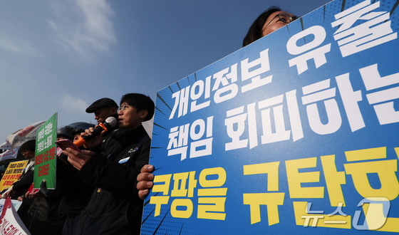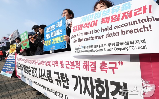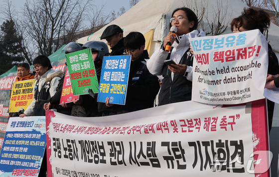 공공운수노조 박정훈 부위원장이 17일 서울 여의도 국회 앞에서 열린 쿠팡 노동자 개인정보 관리 시스템 규탄 기자회견에서 발언하고 있다. 2025.12.17/뉴스1 © News1 김성진 기자