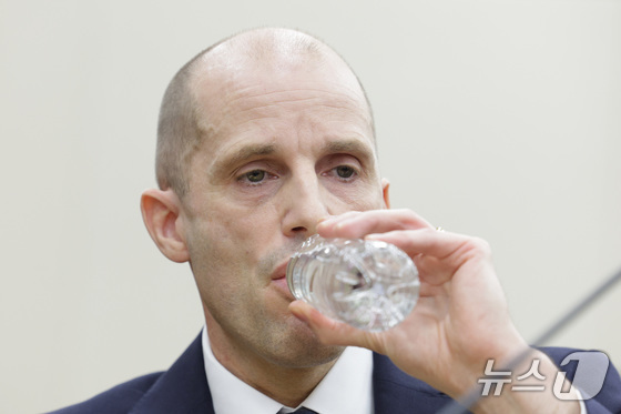 해롤드 로저스 쿠팡 임시 대표가 17일 서울 여의도 국회 과학기술정보방송통신위원회에서 열린 쿠팡 침해사고 관련 청문회에서 목을 축이고 있다. © News1 신웅수 기자