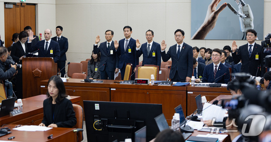 해롤드 로저스 쿠팡 임시 대표와 배경훈 부총리 겸 과학기술정보통신부 장관을 비롯한 증인들이 17일 서울 여의도 국회 과학기술정보방송통신위원회에서 열린 쿠팡 개인정보 유출 사고 관련 청문회에서 증인 선서를 하고 있다. 2025.12.17/뉴스1 © News1 유승관 기자