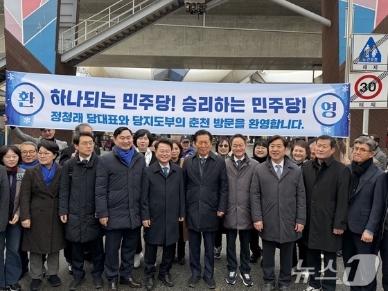17일 강원 춘천 온의동 풍물시장 앞에서 정청래 더불어민주당 대표, 허영 의원, 육동한 춘천시장, 김도균 도당위원장 등 주요 당직자들이 기념촬영을 하고 있다. 2025.12.17/뉴스1 © News1 한귀섭 기자