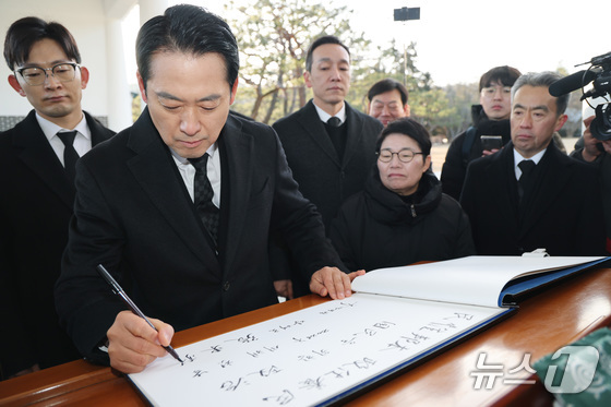 장동혁 국민의힘 대표가 새해 첫 날인 1일 서울 동작구 국립서울현충원에서 현충탑 참배를 마친 후 방명록을 작성하고 있다. 2026.1.1/뉴스1 © News1 임세영 기자