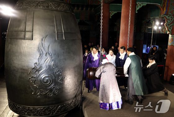 2026년 병오년(丙午年) 첫날인 1일 오세훈 서울시장과 가수 양희은, 션, 육상선수 나마디 조엘 진 등 시민대표들이 서울 종로구 보신각에서 신년 새해맞이 타종행사에서 제야의 종을 울리고 있다. (공동취재) 2026.1.1/뉴스1 © News1 김도우 기자
