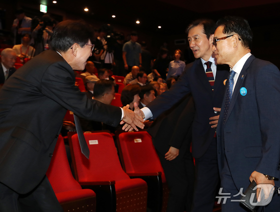 지난해 10월 16일 당시 조국 조국혁신당 비상대책위원장과 박형준 부산시장이 경남 창원 마산회원구 3·15아트센터 대극장에서 열린 제46주년 부마민주항쟁기념에서 악수하고 있다. 2025.10.16/뉴스1 © News1 윤일지 기자