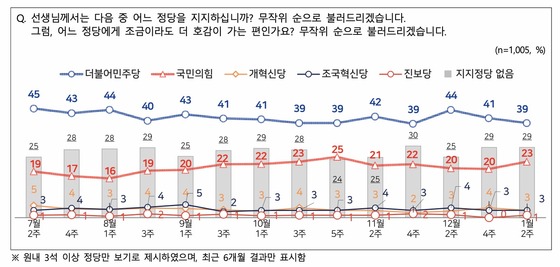 정당 지지도에서는 민주당의 하락세가 뚜렷했다. 민주당 지지율은 39%를 기록하며 지난해 12월 2주차(44%) 이후 12월 4주차(41%)를 거쳐 이번 조사까지 3회 연속 하락세를 이어갔다. 4주 만에 지지율 5%p가 증발한 셈이다.
