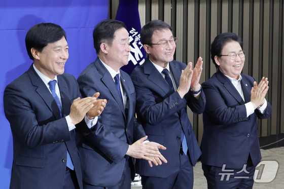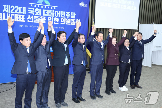 한병도 더불어민주당 신임 원내대표가 11일 서울 여의도 국회에서 열린 제22대 국회 더불어민주당 원내대표 선출을 위한 의원총회에서 신임 최고위원들과 당선 인사를 하고 있다. 왼쪽부터 이성윤·강득구 최고위원, 한 원내대표, 문정복 최고위원. 2026.1.11/뉴스1 © News1 신웅수 기자