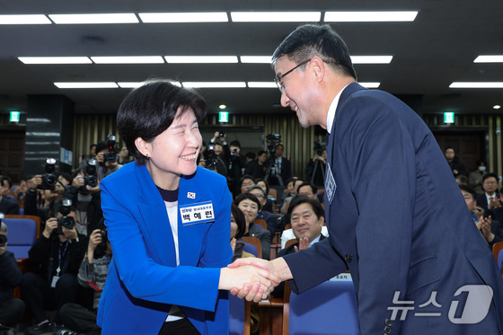 한병도 더불어민주당 신임 원내대표가 11일 서울 여의도 국회에서 열린 제22대 국회 더불어민주당 원내대표 선출을 위한 의원총회에서 백혜련 후보와 악수하고 있다. 2026.1.11/뉴스1 © News1 신웅수 기자