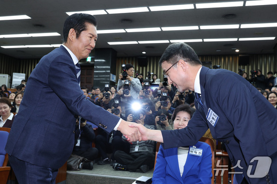 한병도 더불어민주당 신임 원내대표가 11일 서울 여의도 국회에서 열린 제22대 국회 더불어민주당 원내대표 선출을 위한 의원총회에서 정청래 대표와 악수하고 있다. 2026.1.11/뉴스1 © News1 신웅수 기자