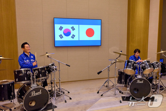 이재명 대통령과 다카이치 사나에 일본 총리가 13일 일본 나라현 회담에서 푸른색 유니폼을 함께 착용하고 즉석 드럼 협주를 하고 있다. (공동취재) 2026.1.13/뉴스1 © News1 이재명 기자