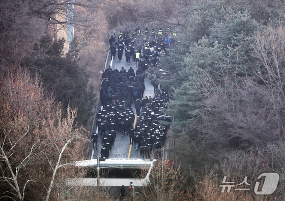 고위공직자범죄수사처와 경찰로 구성된 공조수사본부가 윤석열 대통령에 대한 2차 체포영장 집행에 나선 15일 오전 서울 용산구 한남동 대통령 관저에서 공수처 수사관들과 경찰 인력이 3차 저지선을 뚫고 관저로 향하고 있다. 2025.1.15/뉴스1 © News1 오대일 기자