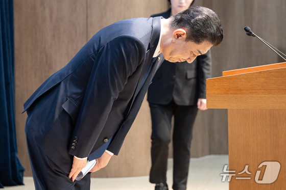 김병기 더불어민주당 의원이 19일 서울 여의도 국회 소통관에서 당 윤리심판원의 제명 결정에 대한 입장을 밝히는 기자회견을 하며 고개 숙여 사과하고 있다. 2026.1.19/뉴스1 © News1 이승배 기자