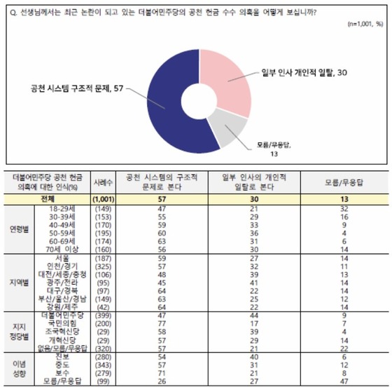 더불어민주당의 공천 헌금 수수 의혹을 공천 시스템의 구조적인 문제라고 보는 여론이 절반을 넘는다는 조사 결과가 22일 나왔다.