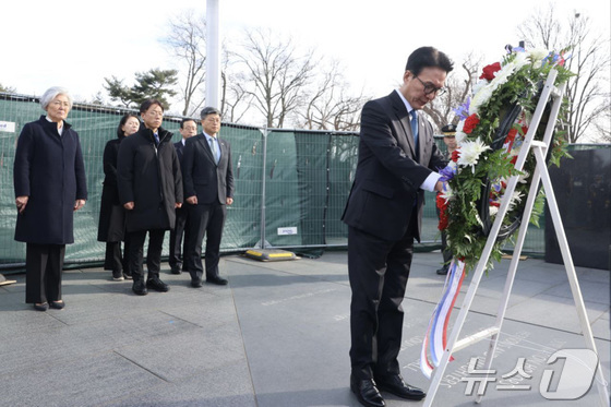 김민석 국무총리가 22일(현지시간) 미국 워싱턴D.C. 한국전 참전기념공원을 방문해 한국전 참전기념비에 헌화하고 있다. (총리실 제공. 재판매 및 DB 금지) 2026.1.23/뉴스1