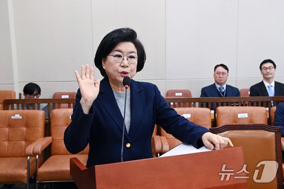 이혜훈 기획예산처 장관 후보자가 23일 서울 여의도 국회에서 열린 인사청문회에 출석해 증인 선서를 하고 있다. 2026.1.23/뉴스1 © News1 국회사진기자단