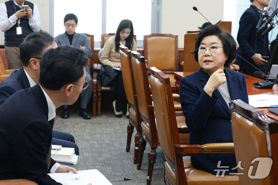 이혜훈 기획예산처 장관 후보자가 23일 서울 여의도 국회에서 열린 인사청문회에 출석해 관계자와 대화하고 있다. 2026.1.23/뉴스1 © News1 국회사진기자단
