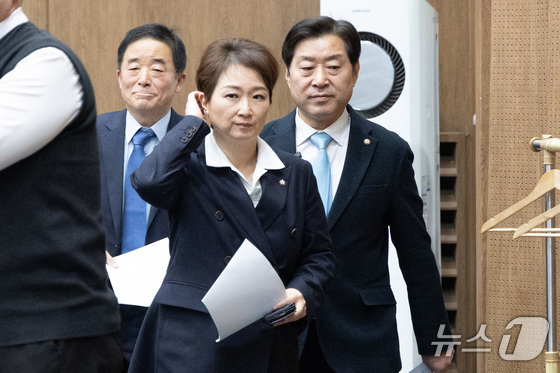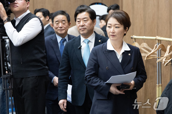 이언주, 황명선, 강득구 더불어민주당 최고위원이 23일 서울 여의도 국회 소통관에서 정청래 대표의 조국혁신당과의 합당 제안과 관련해 규탄 및 사과를 촉구하는 기자회견을 위해 단상으로 향하고 있다. 2026.1.23/뉴스1 © News1 이승배 기자