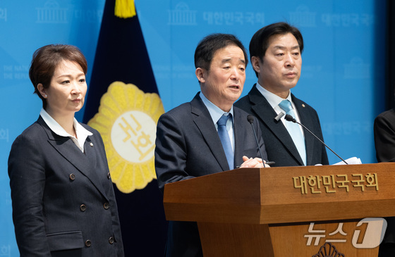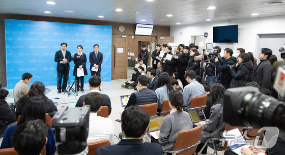이언주, 황명선, 강득구 더불어민주당 최고위원이 23일 서울 여의도 국회 소통관에서 정청래 대표의 조국혁신당과의 합당 제안과 관련해 규탄 및 사과를 촉구하는 기자회견을 마치고 취재진의 질문에 답하고 있다. 2026.1.23/뉴스1 © News1 이승배 기자