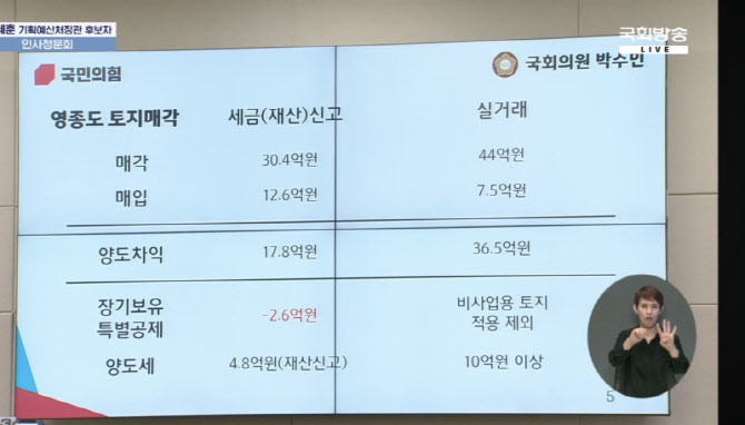 박수민 국민의힘 의원이 23일 국회 재정경제위원회 인사청문회에서 이혜훈 기획예산처 장관 후보자의 배우자의 영종도 부동산 관련 탈세 의혹을 제기하며 공개한 비교 표. (사진=국회방송 화면 갈무리)