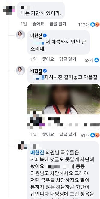 이 중 국민의힘 지지자로 보이는 한 누리꾼이 “니(너)는 가만히 있어라”라고 댓글을 달자, 배 의원은 “내 페북와서 반말 큰 소리네”라고 대댓글을 달았다.