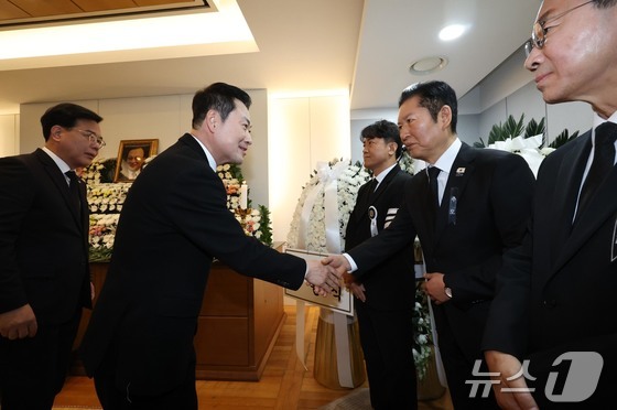 장동혁 국민의힘 대표가 30일 서울 종로구 서울대학교병원 장례식장에 마련된 고 이해찬 전 국무총리의 빈소에서 조문을 한 뒤 정청래 더불어민주당 대표와 악수하고 있다. 2026.1.30/뉴스1 © News1 사진공동취재단