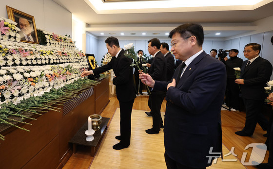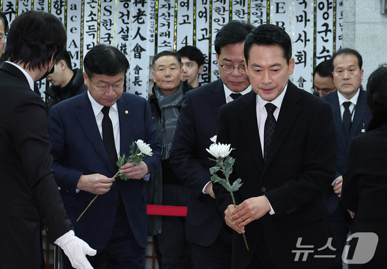 장동혁 국민의힘 대표와 송언석 원내대표, 정점식 정책위의장이 30일 오전 서울 종로구 서울대학교병원 장례식장에 마련된 故 이해찬 전 국무총리의 빈소를 찾아 조문하고 있다. 2026.1.30/뉴스1 © News1 사진공동취재단