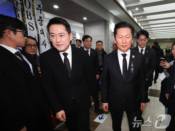 정청래 더불어민주당 대표가 30일 서울 종로구 서울대학교병원 장례식장에 마련된 고 이해찬 전 국무총리의 빈소에서 조문을 마친 장동혁 국민의힘 대표를 배웅하고 있다. 2026.1.30/뉴스1 © News1 사진공동취재단