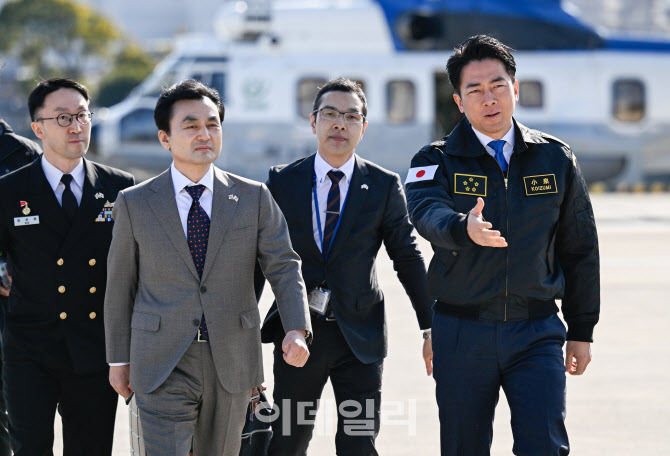 안규백 국방부 장관이 30일 일본 해상자위대 요코스카총감부에 도착해 고이즈미 신지로 일본 방위대신의 안내를 받아 이동하고 있다. (사진=국방부)