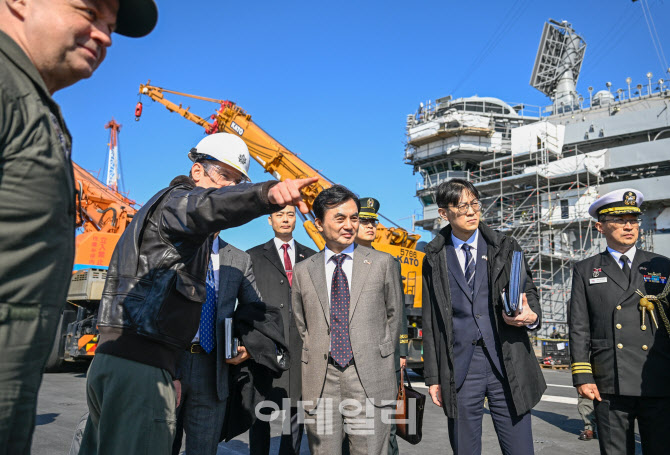 안규백 국방부 장관이 30일 일본 미 해군 제7함대를 방문해 미 해군 항공모함 조지워싱턴함 함상에서 함 승조원으로부터 설명을 듣고 있다. (사진=국방부)